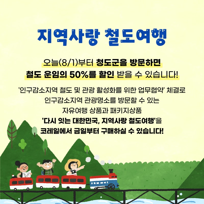 코레일은 가을 기차여행 활성화와 동시에 지역 경제 발전을 도모하기 위해 인구감소지역 방문 시 특별 할인 혜택을 제공합니다. 이는 가을 기차여행을 즐기면서 동시에 지역 경제에 기여할 수 있는 좋은 기회입니다.