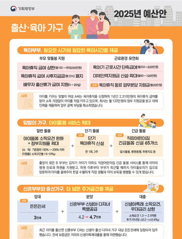맞벌이 부부를 위한 지원도 강화됩니다. 부부가 동시에 육아휴직을 사용할 수 있으며, 이 경우 첫 6개월 동안 최대 3900만원의 지원금을 받을 수 있습니다. 순차적으로 사용해도 동일한 혜택이 적용되니, 부부가 함께 육아에 참여할 수 있는 좋은 기회가 될 것입니다.